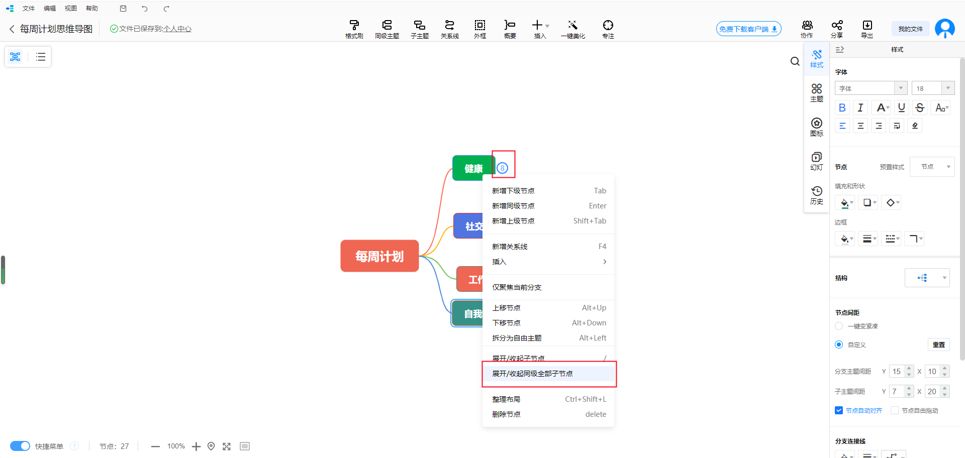 Wählen Sie das Thema aus, für das Sie alle Knoten schnell ausweiten möchten, und wählen Sie im Funktionsmenü, das mit dem rechten Mausklick angezeigt wird, alle Unterknoten der gleichen Ebene ausweiten/zusammenziehen. Oder klicken Sie auf die Zahl rechts vom Thema, das alle Knoten schnell ausbreiten muss, um den Effekt zu erreichen.
