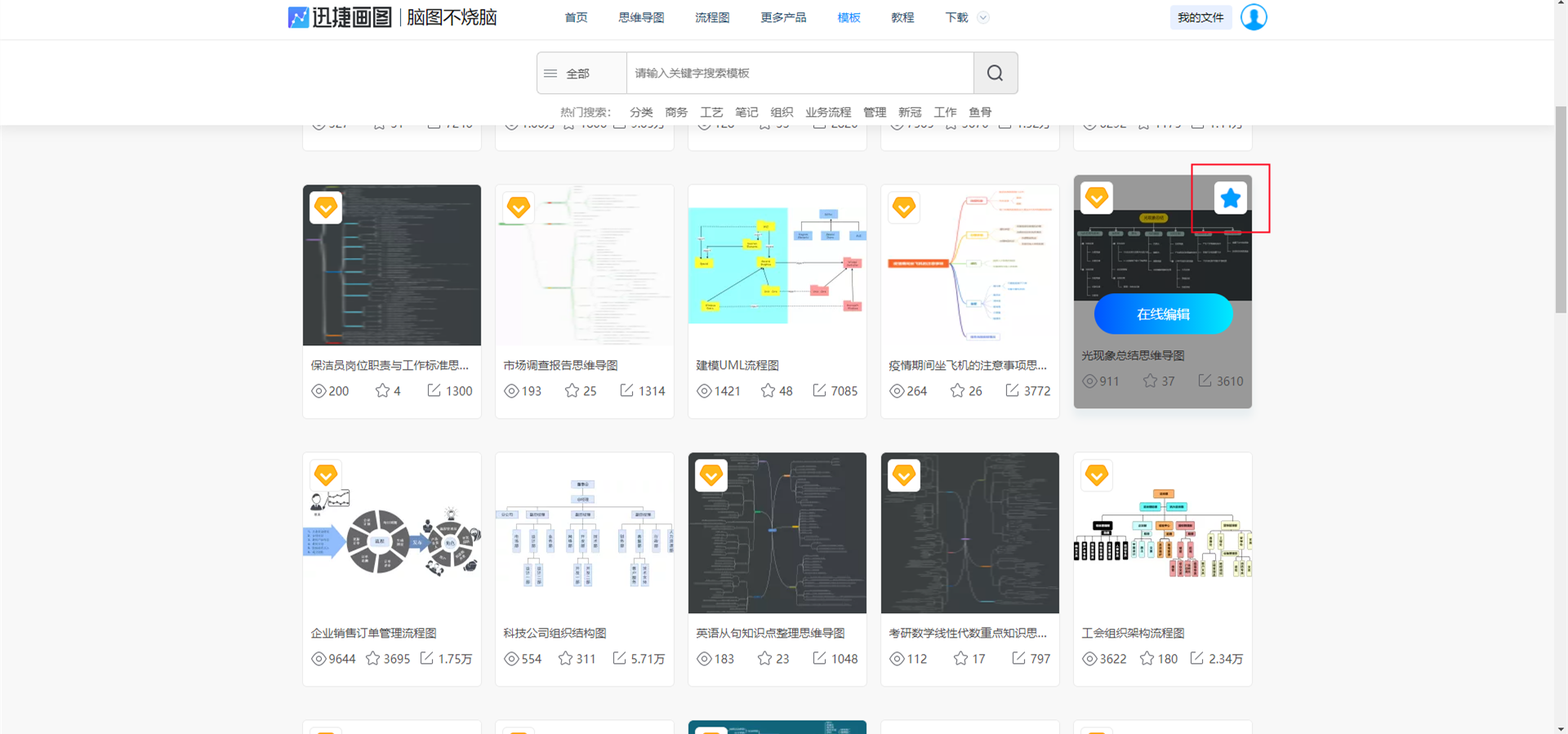 鼠标移动到想要收藏的模板上方,点亮右上角的五角星即可完成模板收藏。同理如果想要取消收藏的话,只需要再次点击右上角的五角星就行。