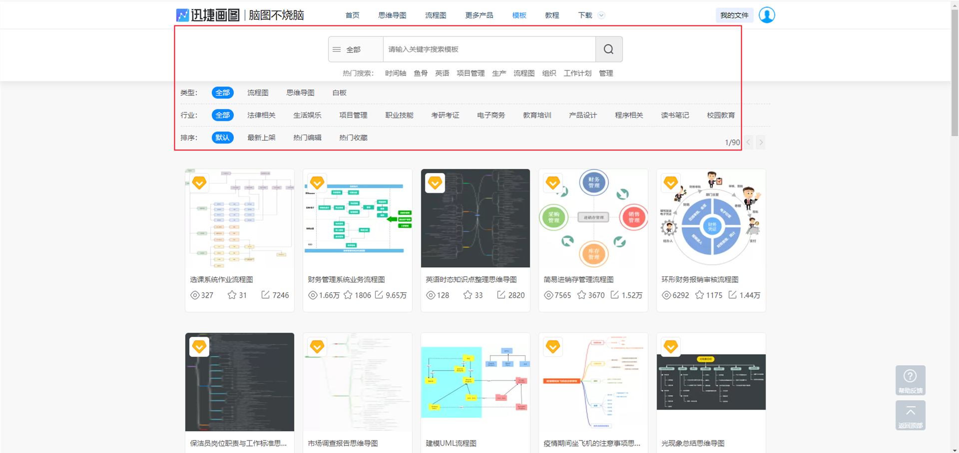 网页会自动跳转到模板页面,在这里我们可以找到大量专业的模板,在上方的检索框中输入关键词即可快速找到需要的模板。除此之外,这里的模板是按照一定类型进行分类的,根据类型标签同样可以快速查找到我们想要的模板。
